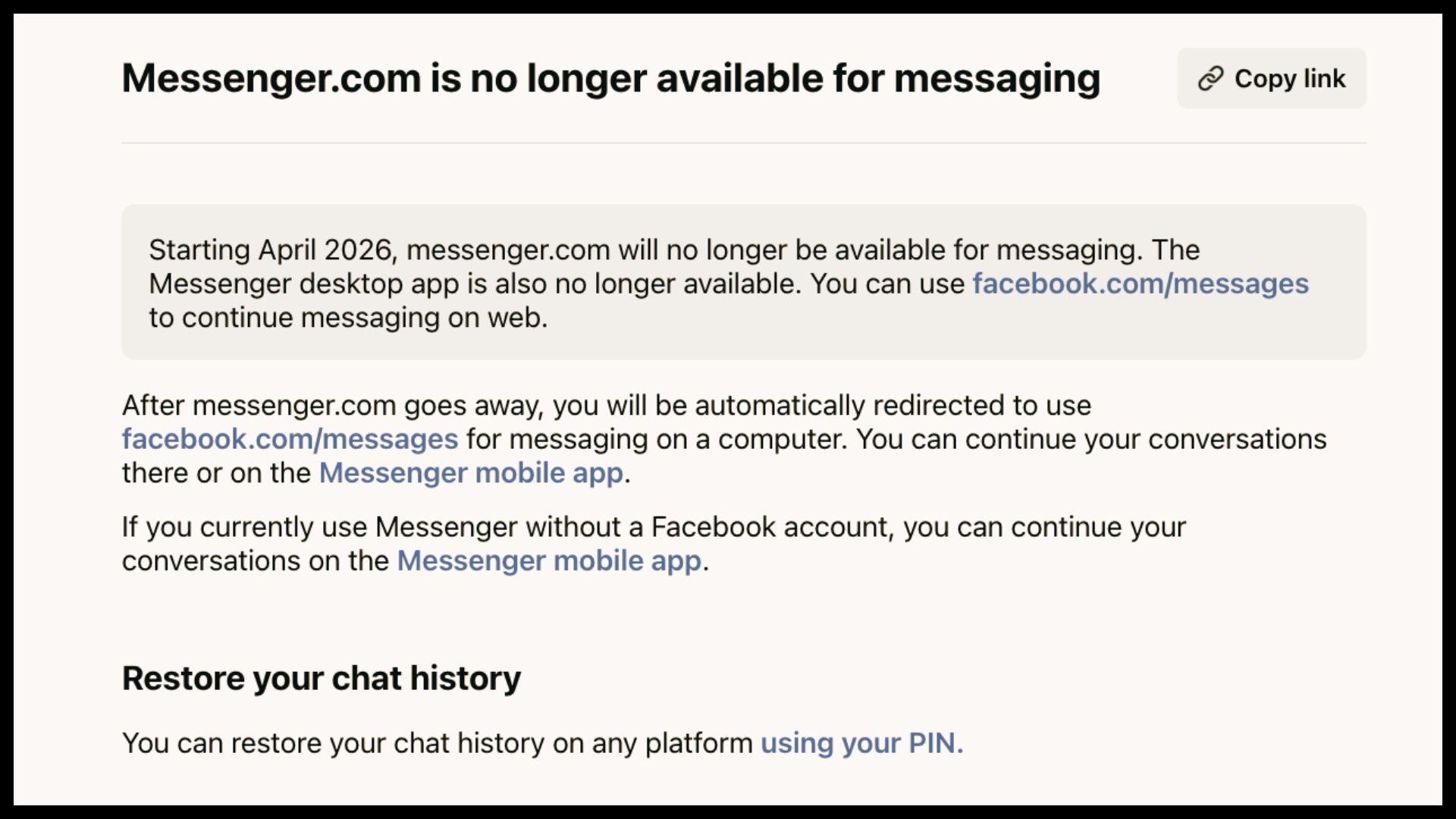 For individuals who use Messenger without a Facebook account, the notice states they can continue accessing conversations through the Messenger mobile application. The page also provides instructions on restoring chat history across platforms using a personal identification number (PIN).